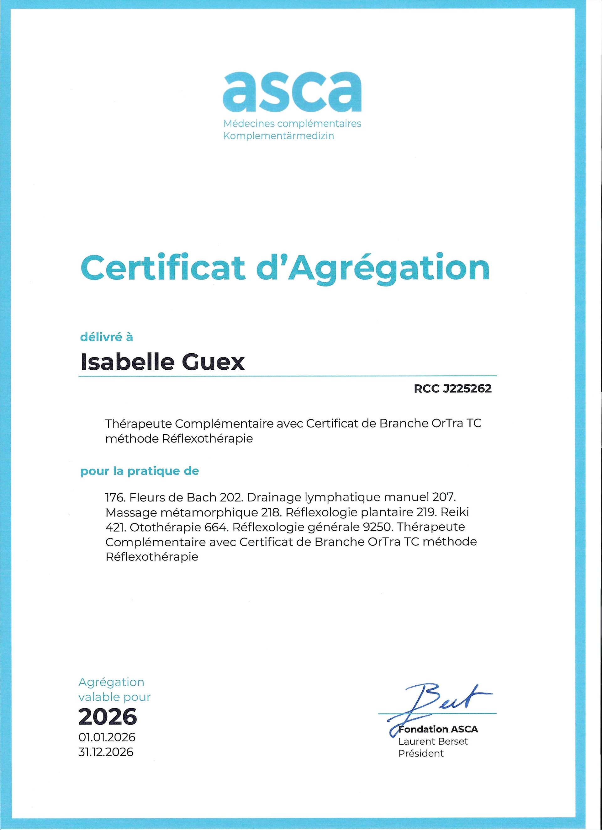 Certains soins sont en partie remboursés par de nombreuses assurances complémentaires. (Liste des caisses maladie affiliée ASCA : ASCA et liste RME : RME ainsi que Visana).Chaque patient doit préalablement s'informer auprès de sa caisse maladie si la thérapie et le thérapeute choisis sont remboursés par son assurance complémentaire. Les conditions de remboursement sont propres à chaque caisse et dépendent de l'étendue de votre couverture.